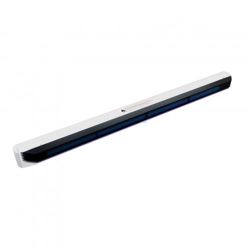 - Унікальна конструкція екрана-жалюзі відсікає промені так, що нижня межа зони прямого випромінювання проходить паралельно підлозі, забезпечуючи безпечне знаходження людей у нижній частині знезаражуваного приміщення.