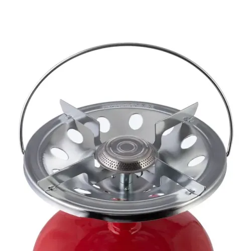 Баллон имеет широкое дно с подставкой, поэтому он устойчиво стоит даже на неровной земле. Ручка, размещенная на горелке для более удобного переноса всего комплекта.