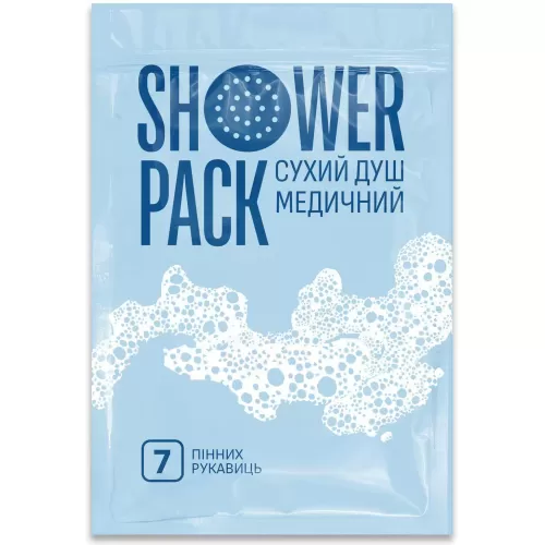 Сухой душ медицинский Shower Pack – это 7 двусторонних пенных перчаток для 7 полноценных умываний. Достаточно 50 мл воды, чтобы подарить ощущение свежести и чистоты всему телу. Перчатка очень хорошо пенится, а гель в ее составе – гипоаллергенный. Сухой душ поможет в уходе за больными кроватями дома и в медицинских заведениях!