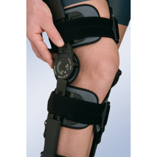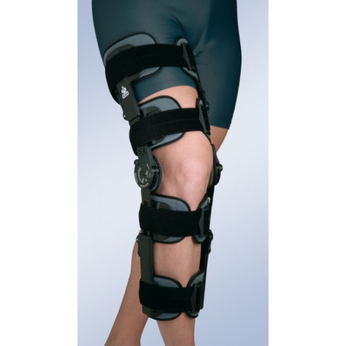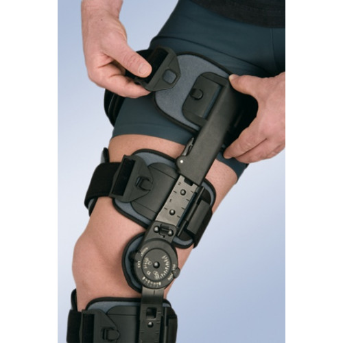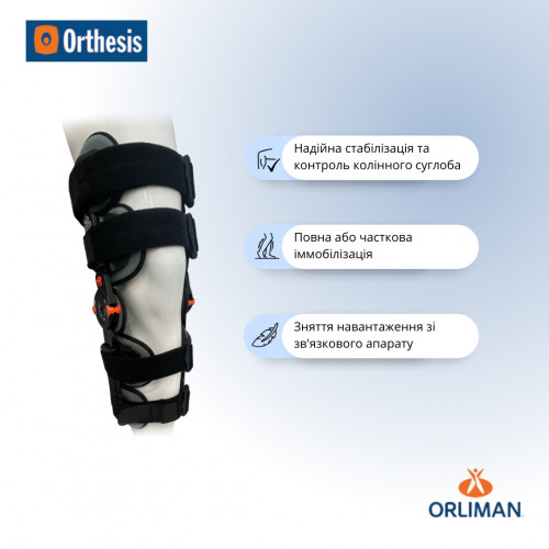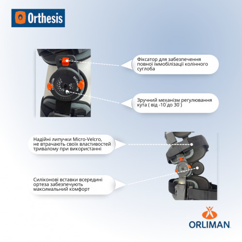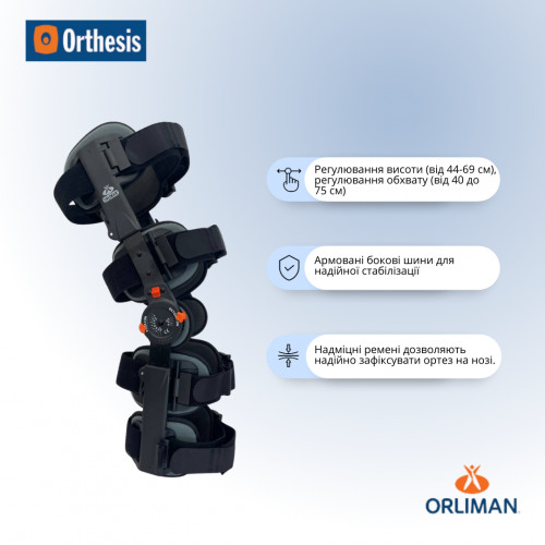 Ортез на колінний суглоб із замком для контролю згинання - розгинання в інтервалах 10º від 0º до 120º та від – 10º до +30º. Ортез дозволяє іммобілізувати колінний суглоб, потім поетапно збільшувати діапазон руху в колінному суглобі на різних етапах реабілітації. Ортез універсального розміру, що регулюється по висоті від 44-69 см. Фіксуючі ремені з липучками Micro-Velcro дозволяють регулювати ступінь прилягання ортезу до ноги. Усередині всі елементи ортезу виконані з м'якого, приємного на дотик матеріалу, який не викликає подразнень та алергії навіть при прямому контакті зі шкірою.