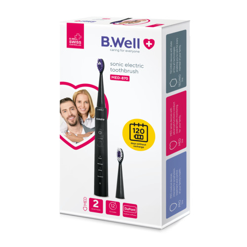B.Well MED-870 - електрична звукова зубна щітка, створена для ефективного та делікатного очищення зубів, міжзубних проміжків і масажу ясен. Технологія звукових коливальних рухів дозволяє очищати поверхню зуба навіть у найбільш важкодоступних місцях, а високоякісні щетинки DuPont безпечні для емалі та ясен. 12 режимів роботи допомагають регулювати інтенсивність вібраційної насадки та знайти ідеальний режим для чищення зубів.