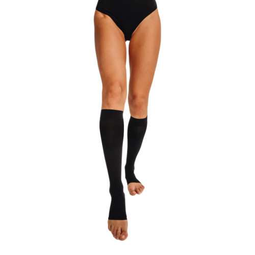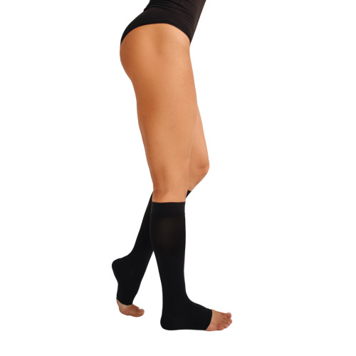 Медичні компресійні гольфи з відкритим носком 9210– вироблені з медичного компресійного трикотажу, забезпечують ідеальну посадку та завдяки помірному рівню компресії можуть бути рекомендовані для носіння на початкових стадіях захворювань вен. Градуйована компресія ефективно розподіляє тиск знизу вгору, найбільший тиск в ділянці гомілки, який поступово зменшується, що сприяє покращенню циркуляції крові.