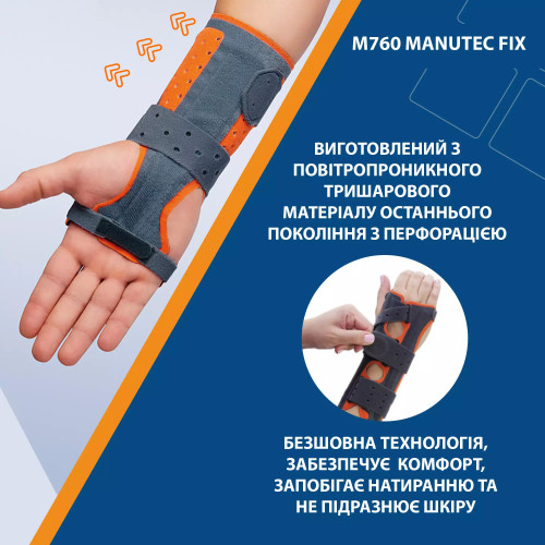 Жорсткий ортез променево-зап'ясткового суглоба Manutec Fix виготовлений з повітропроникного та вологопоглинаючого інноваційного тришарового матеріалу останнього покоління – велюр, піна, бавовна. Для забезпечення ідеального мікроклімату під ортезом поверхня перфорована. Виріб має сучасний дизайн. Конструкція забезпечує потрійну іммобілізацію суглоба за рахунок двох латеральних алюмінієвих шин та однієї медіальної. Система ременів та фіксаторів із застібками Micro-Velcro має спеціальну форму та конструкцію для забезпечення ідеальної посадки та прилягання виробу до тіла.