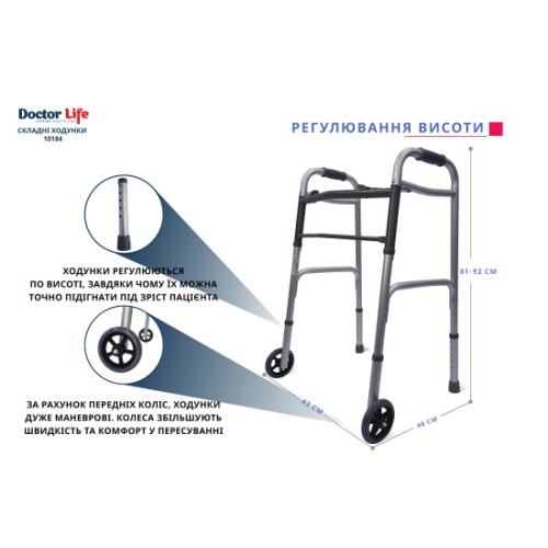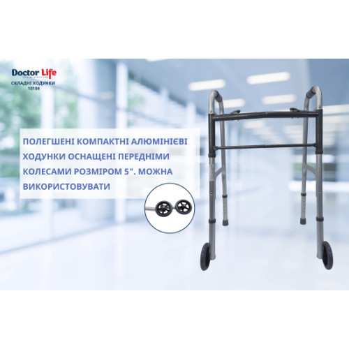 Полегшені алюмінієві ходунки для зручності переміщення оснащені передніми колесами розміром 5”.