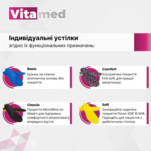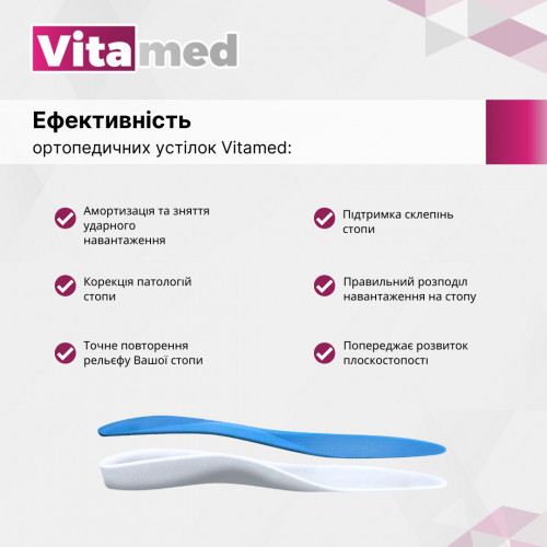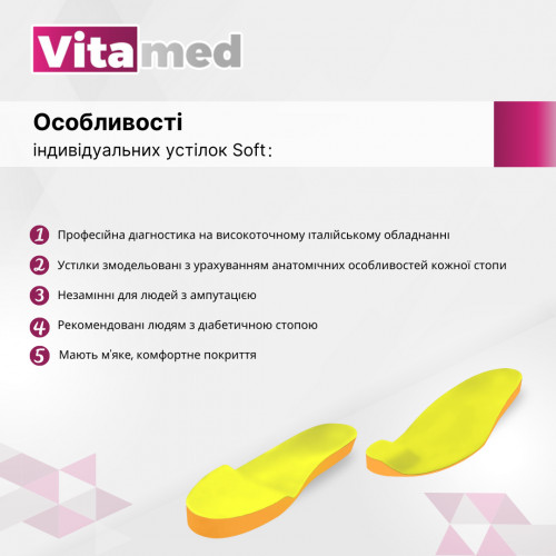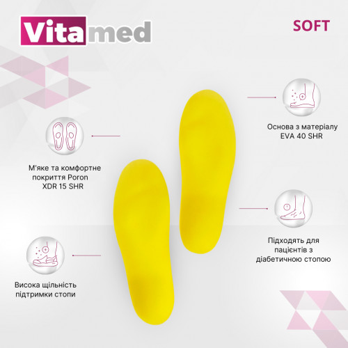 Vitamed Soft – надзвичайно комфортна устілка, спроектована спеціально для людей з особливими потребами до м’якого покриття і розвантаження специфічних зон (наприклад, при синдромі діабетичної стопи). Комбінація анатомічної основи EVA з щільністю 40SHR та інноваційного надм’якого покриття Poron XDR 15 SHR, забезпечують максимально надійну підтримку склепінь без втрати комфорту під час використання. Устілки дозволяють зменшити ударне навантаження на стопу та суглоби та ідеально підходять пацієнтам з чутливою шкірою стоп та діабетичною стопою. Виготовляються на сучасному, високоточному італійському обладнанні за технологією тривимірного моделювання та фрезерування.