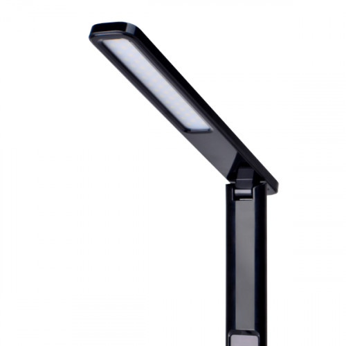 Конструкція дозволяє складати лампу навпіл, економить робоче місце днем і зручна для експлуатації та транспортування. За допомогою рухомого кріплення ви легко зможете змінити кут освітлення. Кут розсіювання світла у даній настільній лампі складає 120°. LCD дисплей показує годинник, будильник, календар, термометр. Підсвічування ЖК дисплея в разі потреби можна вимкнути. Дисплей можна налаштувати за допомогою кнопок, які знаходяться на зворотному боці корпусу настільної лампи.