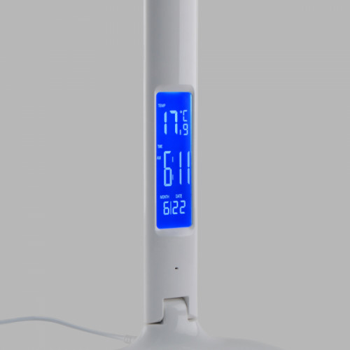 Конструкція дозволяє складати лампу навпіл, економить робоче місце днем і зручна для експлуатації та транспортування. За допомогою рухомого кріплення ви легко зможете змінити кут освітлення. Кут розсіювання світла у даній настільній лампі складає 120°. LCD дисплей показує годинник, будильник, календар, термометр. Підсвічування ЖК дисплея в разі потреби можна вимкнути. Дисплей можна налаштувати за допомогою кнопок, які знаходяться на зворотному боці корпусу настільної лампи.