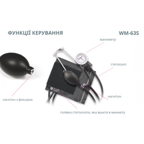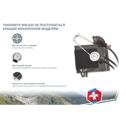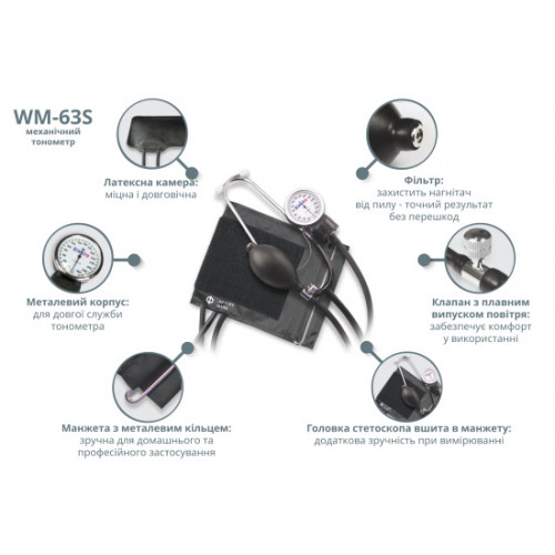 Механічний тонометр для вимірювання артеріального тиску вибирають багато лікарів, а також ті, хто віддає перевагу класичному методу вимірювання. Завдяки вбудованому стетоскопу та манжеті з кільцем WM-63S підходить навіть для самостійного контролю тиску.