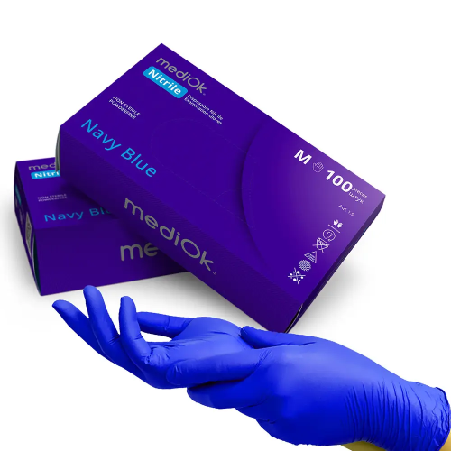 Нітрилові рукавички Mediok Navy — це надійні одноразові рукавички темно-синього кольору, які поєднують щільність 3.7 г, комфорт та охайний вигляд. Вони не містять латексу, гіпоалергенні, мають текстуровані пальці та універсальну форму, підходять для багатьох сфер — від медицини до косметології та HoReCa.