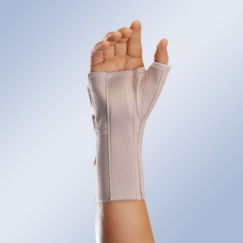 Ортез виконаний з еластичного повітропроникного матеріалу, що забезпечує відмінну циркуляцію повітря. По тильній поверхні розташовуються міцні застібки, по долонній поверхні розташовуються 2 пластини з алюмінію, одна іммобілізує рухи в променево-зап'ястковому суглобі, друга - рухи першого пальця кисті. Самі шини жорсткі, але піддаються моделюванню. Ортез забезпечує помірну компресію і виключає рухи в променево-зап'ястковому суглобі, і рухи першого пальця кисті. Довжина - 20 см. Підбирається за розміром кола зап'ястя на праву чи ліву руку.