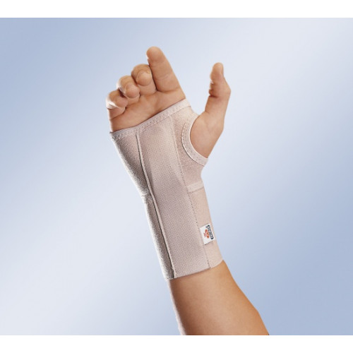 Ортез виконаний з еластичного повітропроникного матеріалу, який забезпечує відмінну циркуляцію повітря. По тильній поверхні розташовуються ремені з міцними застібками, по долонній поверхні знаходиться жорстка пластина з алюмінію, пластина при необхідності піддається моделюванню. Ортез забезпечує помірну компресію і виключає рухи в променево-зап'ястковому суглобі. Довжина - 18 см. Підбирається за розміром кола зап'ястя на праву чи ліву руку.
