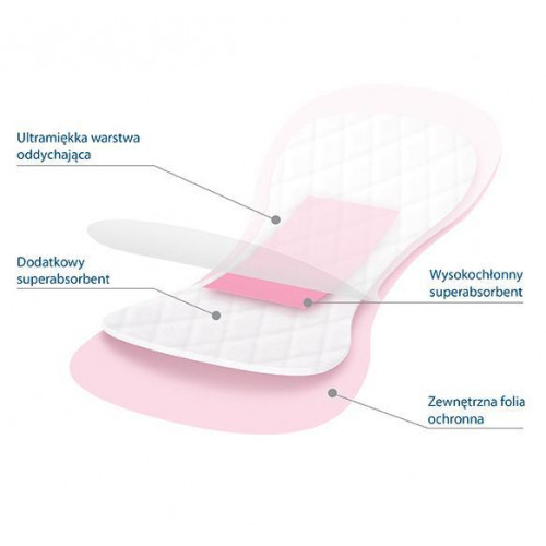 Накладка складається з 4 шарів. Дихаючий і екстра м'який внутрішній шар полегшує циркуляцію повітря та забезпечує відчуття свіжості. Два шари, що містять суперпоглинаючий матеріал, складають подвійний замок для вологи, зберігаючи його надійно всередині прокладки та нейтралізуючи будь-які неприємні запахи. Зовнішній шар фольги запобігає просоченню вологи, захищаючи нижню білизну від забруднення.