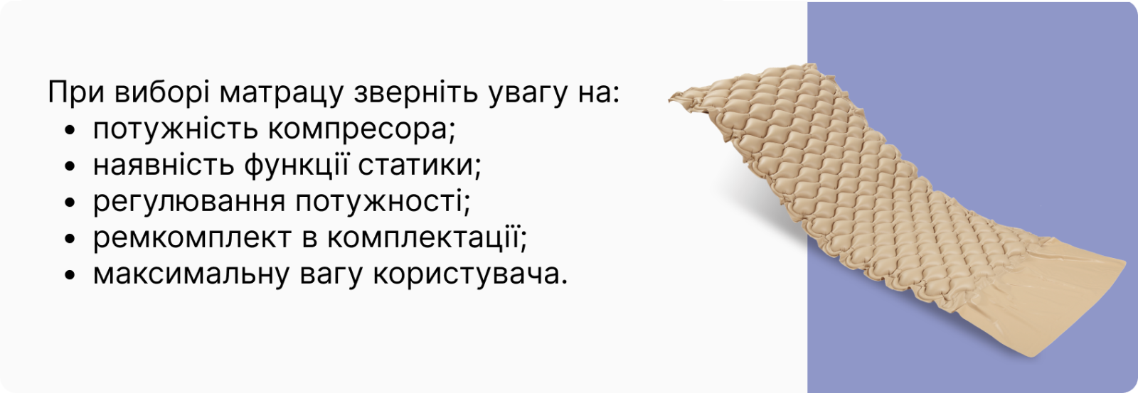 Матрац працює за принципом зміни тиску повітря в двох групах камер. Це забезпечує постійну зміну «точок опори» та здійснює постійний «ефект масажу», що покращує трофіку шкіри та попереджає виникнення пролежнів у користувачів, а також полегшує догляд за тяжкохворими.