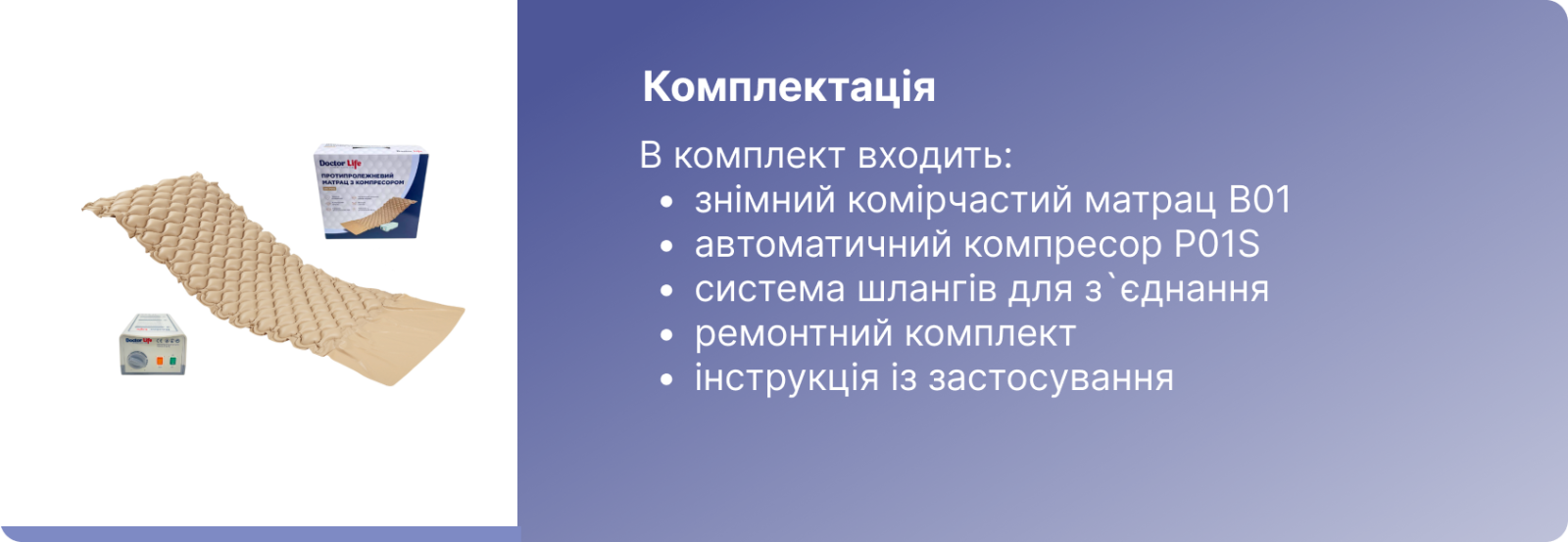 Комірчастий протипролежневий матрац з компресором Doctor Life B01-P01S призначений для людей, які тривалий час знаходяться у лежачому положенні. Рекомендований для профілактики і лікування пролежнів 1–2 ступенів.