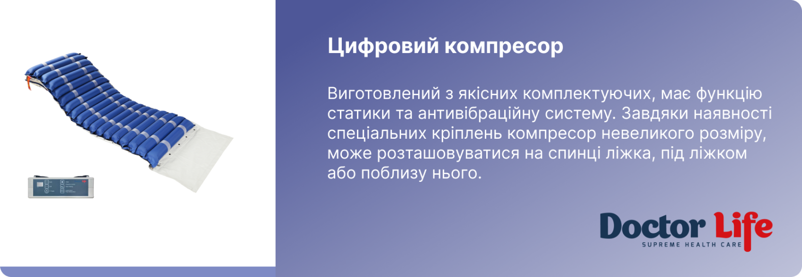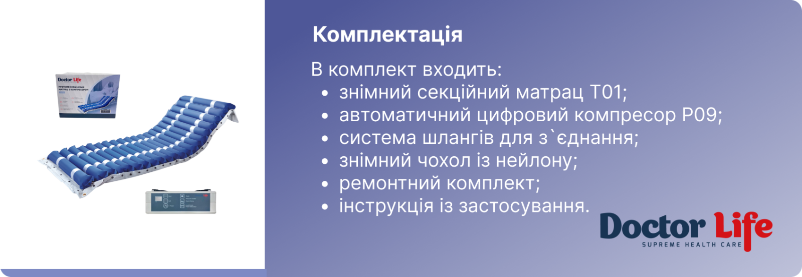 Комірчастий протипролежневий матрац з компресором Doctor Life T01-P09 призначений для людей, які тривалий час знаходяться у лежачому положенні. Рекомендований для профілактики і лікування пролежнів 1–2 ступенів.