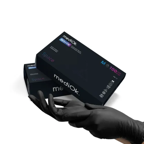 Нітрилові рукавички Mediok Space — це одноразові рукавички в глибокому чорному кольорі, які виглядають стильно, стримано та професійно. Вони забезпечують високу ступінь захисту шкіри рук під час роботи з рідинами, інструментами, хімічними речовинами.