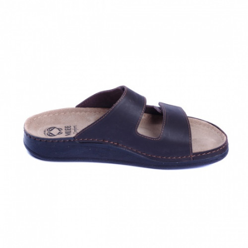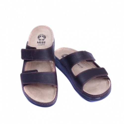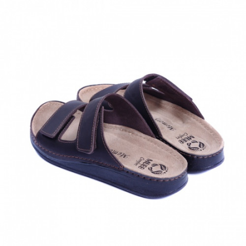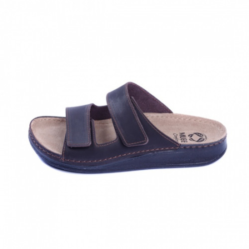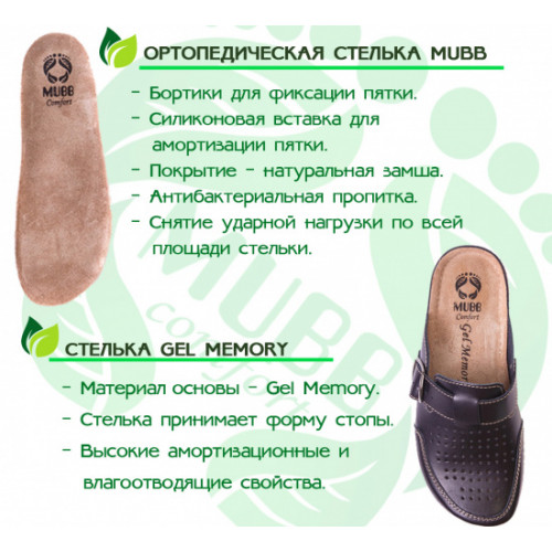 Верх взуття виконаний з натуральної шкіри. Головною особливістю є анатомічна підошва із поглибленням ложа стопи. Ортопедична устілка підтримує склепіння стопи і має високі амортизаційні властивості. Клейово-прошивний метод робить взуття більш міцним, а підошва з поліуретану має протиковзний ефект. Ремінцями можна відрегулювати ширину посадки.