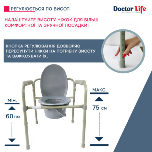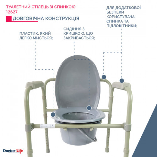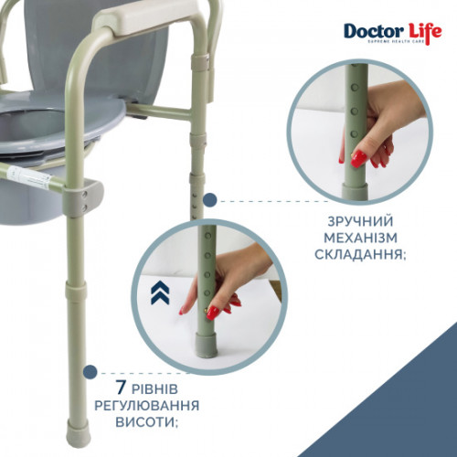 Стул-туалет призначений для санітарно-гігієнічних процедур при догляді за ослабленими користувачами. Для зручності використання та санітарного очищення стілець має стійку конструкцію з кришкою та відром. Складаний механізм дозволяє скласти стілець до компактних розмірів. Для додаткової безпеки користувача стілець має бічні підлокітники та спинку.