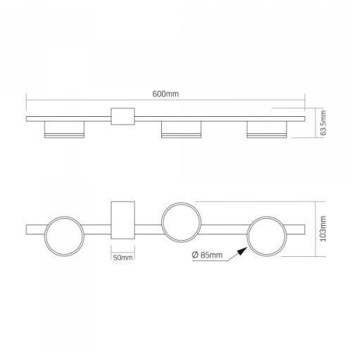 В якості джерела світла в даній моделі використовуються 3 лампочки з цоколем GX53 і максимальною потужністю до 30W кожна. Габаритні розміри складають: основа - 80х50x35мм, планка довжиною 600мм, а голова світильника має діаметр 85мм і висоту 38мм кожна (3шт). Загальна довжина світильника складає 600мм, ширина 103мм, а висота 63.5мм.